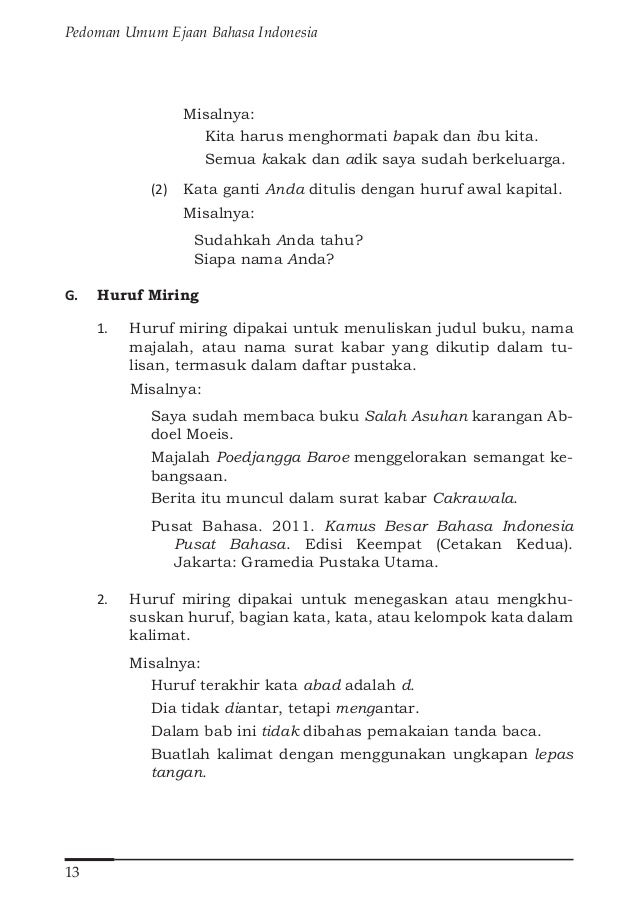 Dalam aktivitas berbasa tulis khususnya penulisan karya tulis ilmiah di samping perbendaharaan kata dan tata bahasa, ejaan memegang peranan yang cukup penting agar tulisan yang dibuat tertata dengan baik. Penulisan judul buku yang benar sesuai pedoman umum ejaan bahasa indonesia (puebi) cara membuat judul buku yang menarik. Ejaan republik dimuat dalam surat keputusan menteri pendidikan dan kebudayaan mr. (pedoman umum ejaan bahasa indonesia). Semua kalimat ditulis menggunakan tata bahasa baku dan sedapat mungkin menggunakan istilah indonesia. Pencetakan pedoman umum ini dilaksanakan oleh proyek penulisan dan Penulisannya harus disesuaikan dengan pedoman atau standar ilmiah yang telah ditentukan. Bahasa indonesia dalam penulisan karya ilmiah. Naskah lengkap usulan penelitian atau skripsi disusun dalam bahasa indonesia yang baku sesuai dengan ketentuan pedoman umum ejaan bahasa indonesia tahun 2016 (be rdasarkan permendikbud no 50 tahun 2015). Meskipun semasa sekolah kita telah diajarkan mengenai cara menulis judul tulisan yang benar, namun pada kenyataannya masih saja banyak yang belum paham bagaimana cara penulisan judul yang benar sesuai dengan kaidah eyd atau puebi (pedoman umum ejaan bahasa indonesia). (2) pedoman umum ejaan bahasa indonesia sebagaimana dimaksud pada ayat (1) tercantum dalam lampiran yang merupakan bagian tidak terpisahkan dari peraturan menteri ini. Satu paragraf terdiri dari minimal dua kalimat, yakni kalimat inti dan kalimat penjelas. Setiap karya tulis ilmiah memiliki style guide atau selingkung yang berarti pedoman tata cara penulisan yang ditentukan oleh jenis tulisan dan tujuan karya tulis ilmiah ini dibuat.