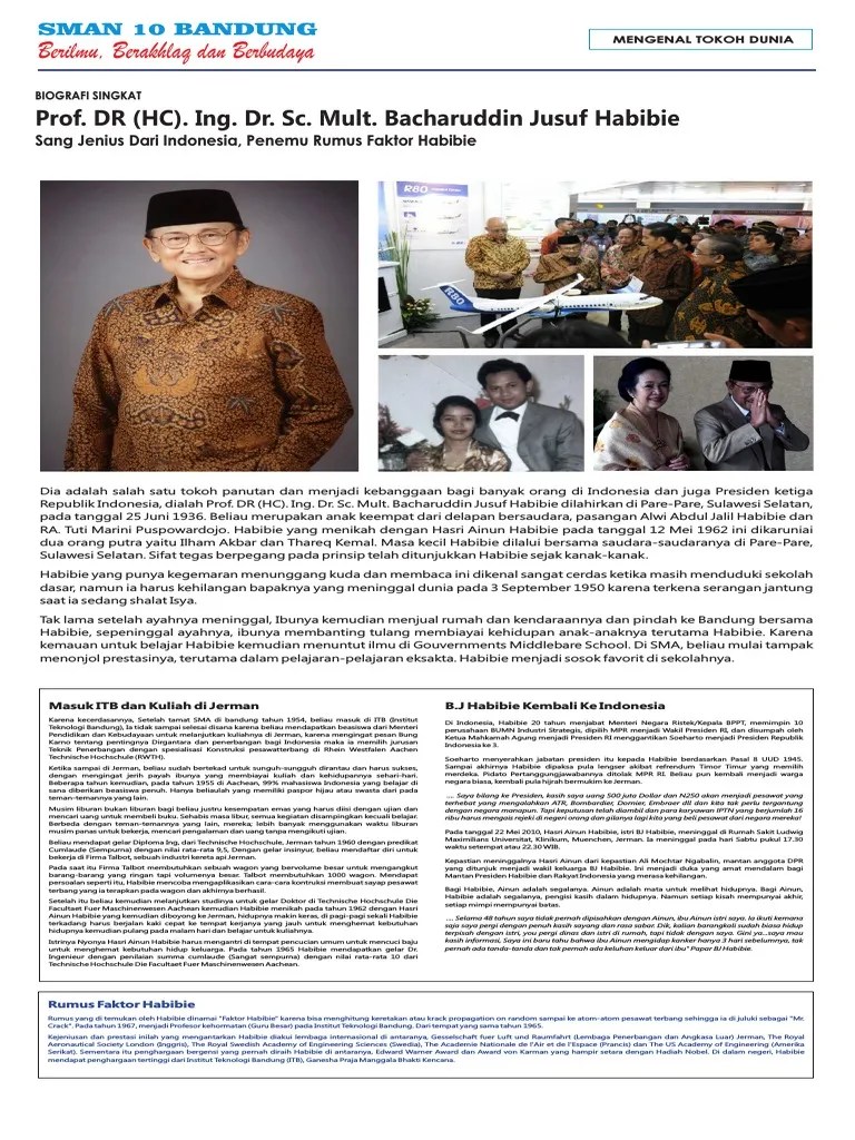 Presiden joko widodo memimpin upacara pemakaman kenegaraan jenazah politikus dan ilmuwan yang disegani itu pada kamis siang (12/9/2019). Oleh sebab itu profil dan biografi bj habibie sangat menarik untuk di ketahui. Ia dikenal cerdas sejak duduk di bangku sekolah dasar, namun ia harus kehilangan ayahnya tercinta yang meninggal dunia pada 3 september 1950 karena serangan jantung. Bahasa indonesia's 215 teks biografi b.j. Habibi menjadi yatim sejak bapaknya yang meninggal dunia pada 3 habibie adalah salah seorang tokoh panutan dan menjadi kebanggaan bagi banyak orang di indonesia. Orientasi adalah tahap awal dalam teks biografi. struktur merupakan bagian dari sebuah teks itu sendiri, struktur ini artinya susunan. Belajar dengan giat agar dapat masuk jurusan teknik di universitas brawijaya malang sesuai dengan harapan orang tua. Berbisnis dalam bidang peternakan dan pangan membuatnya menjadi salah satu pengusaha sukses yang dikenal oleh masyarakat. analisis teks biografi 2 tokoh 1. Pada bagian berikut siswa akan mempelajari contoh analisis struktur tek biografi bj habibie di atas. teks biografi memiliki tiga struktur yang perlu diperhatikan, antara lain: