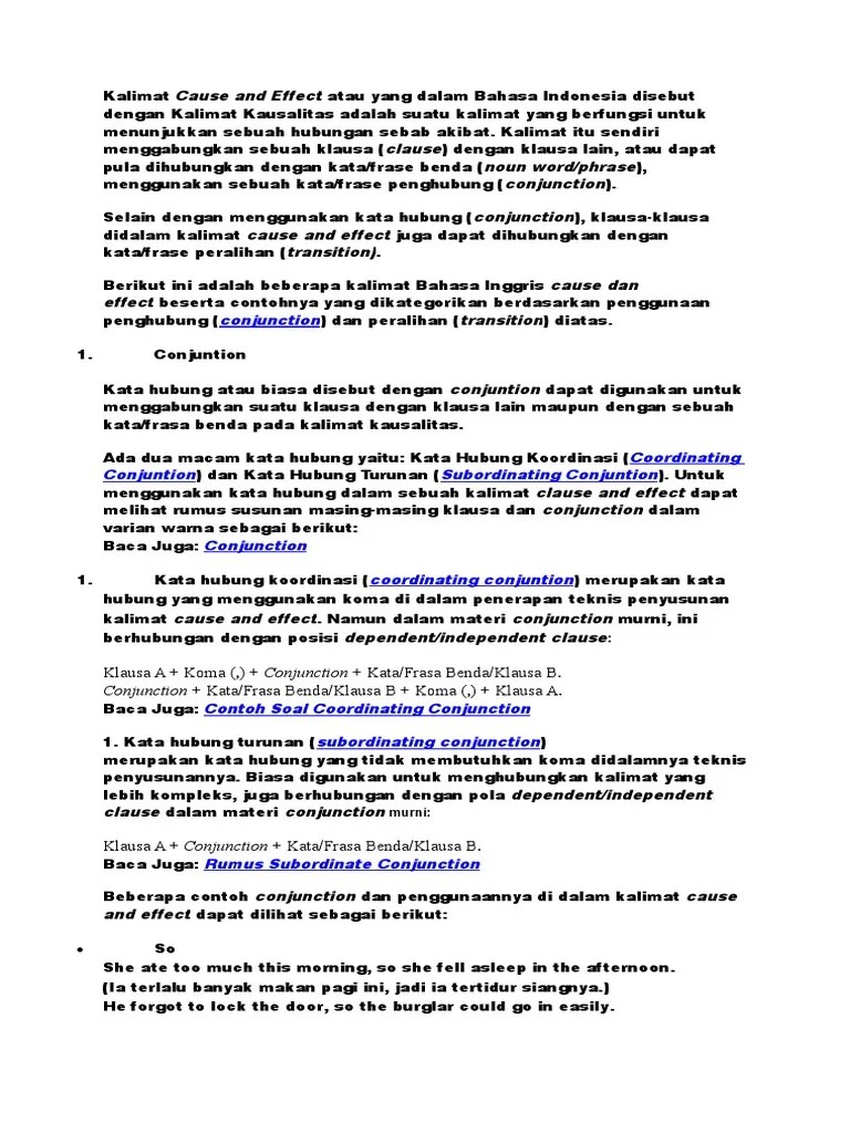 Dengan signal words yang diikuti noun/noun phrase:. Cause and effect terbagi menjadi . 40 kalimat bahasa inggris cause dan effect beserta contohnya yang dapat. Dibawah ini adalah essay atau . · since we run out of eggs, i have to go to . Bagaimana ya mengerjakan soal cause and effect ini dengan memanfaatkan berbagai conjunctions tersebut? Berikut soal cause and effect dan jawabannya. Itu yang akan kita bahas di video . Namun, dalam prakteknya tidak jarang juga effect ditulis lebih dahulu dan diikuti oleh cause seperti dalam contoh kalimat sebab akibat di . Kalimat cause and effect biasa juga disebut dengan kalimat sebab akibat. Ada rumus serta contoh kalimatnya juga lho! So that, therefore, because, but dan although beserta contoh kalimatnya Berikut ini contoh cause and effect sentences dalam bahasa inggris: